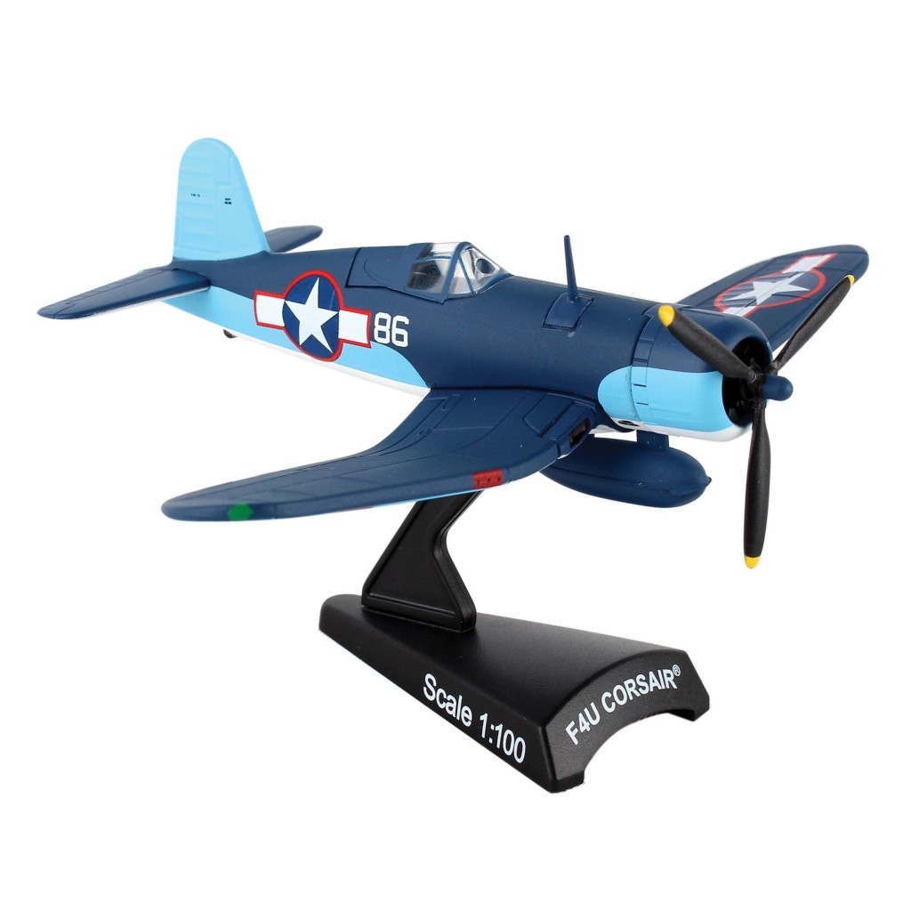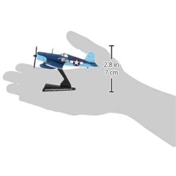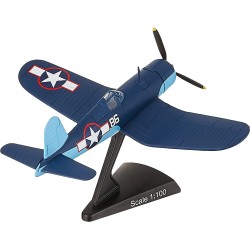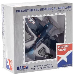 F4U aircraft #86 was piloted by Maj. Gregory "Pappy" Boyington, Commanding Officer of the VMF-214 "Black Sheep" Squadron who fought their way to fame in the Pacific Theatre of World War II. Flying out of their home airfield out of Vella Lavella, the "Black Sheep" piled up a record 203 planes destroyed or damaged, troop transports and supply ships sunk, and ground installations destroyed in their first 84 days. Boyington himself claims a record 28 total kills. He was shot down on January 3, 1944 and was a prisoner of war for 20 months until the Japanese surrender. He was awarded both the Medal of Honor and Navy Cross on October, 1945. The mid-1970s television show "Baa Baa Black Sheep" was very loosely based on his memoirs. This Die-cast metal airplane model comes in 1:100 scale with plastic stand and model is approximately 10 cm long with 13 cm wingspan.