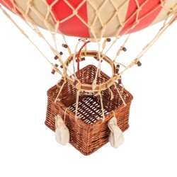 Helium balloons were one of aviation’s first successes. Since 1783, balloons have traveled the skies, often in unintended directions. Hand applied balloon strips. Hand woven netting and basket. Wooden toggles and sand bags.