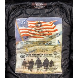 We took our original Top Gun® B-15 jacket, and created a version featuring assorted patches created solely for Top Gun. The B-15 is the initial nylon flight jacket that was designed in about 1944, and it featured a mouton fur collar, which made sure that our Air Force pilots were kept warm.